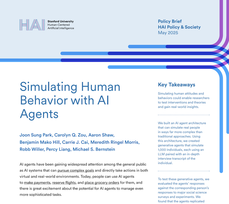 Human societies are complex systems. Our institutions, platforms, and policies rest on assumptions about how people perceive, decide, and act. I am a computer scientist who builds societal simulations to test—and challenge—those assumptions so we can better reason about high‑stakes decisions. My research introduced generative agents, language‑model‑based actors with memory, reflection, and planning, and developed methods to ground these agents in real‑world data and validate their simulated attitudes and behaviors against ground truth. I run population‑scale simulations with agents representative of real‑world populations.